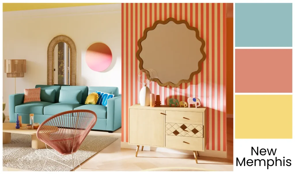 Pour une déco audacieuse et créative, laissez-vous tenter par le style New Memphis. Motifs géométriques et palettes éclatantes dominent cette tendance. Adieu la monotonie, place aux jeux de formes et aux couleurs vives !