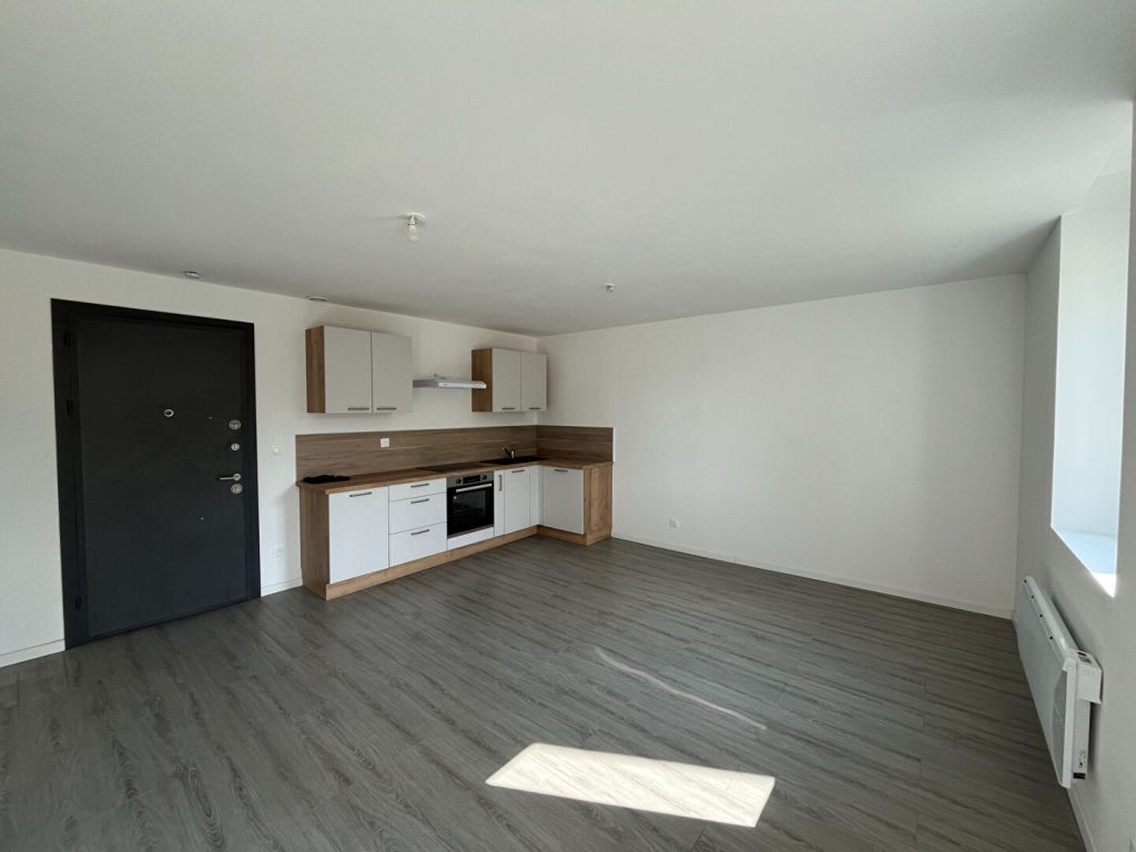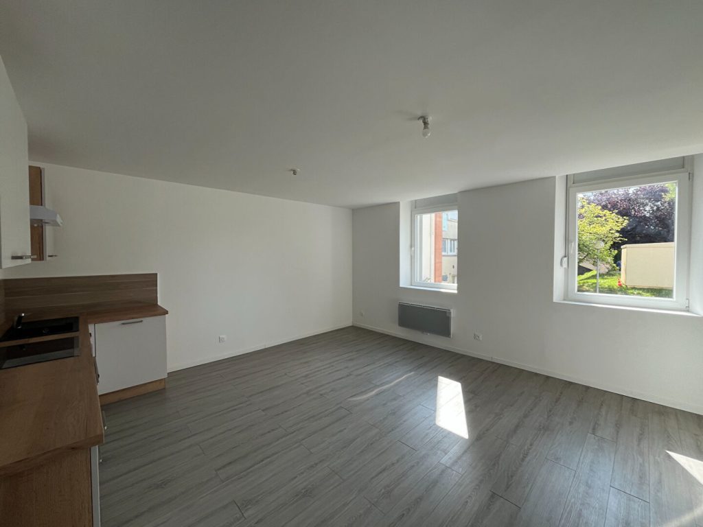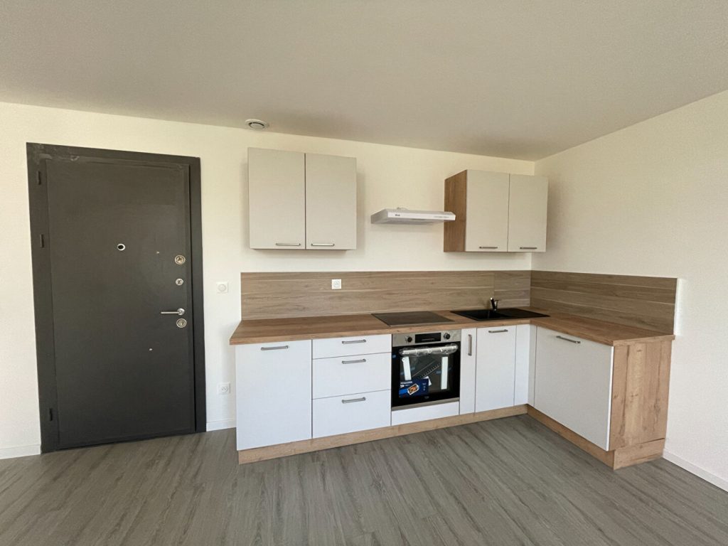 Il comprend : Une cuisine équipée (four, plaque, hotte) ouverte sur séjour, chambre,