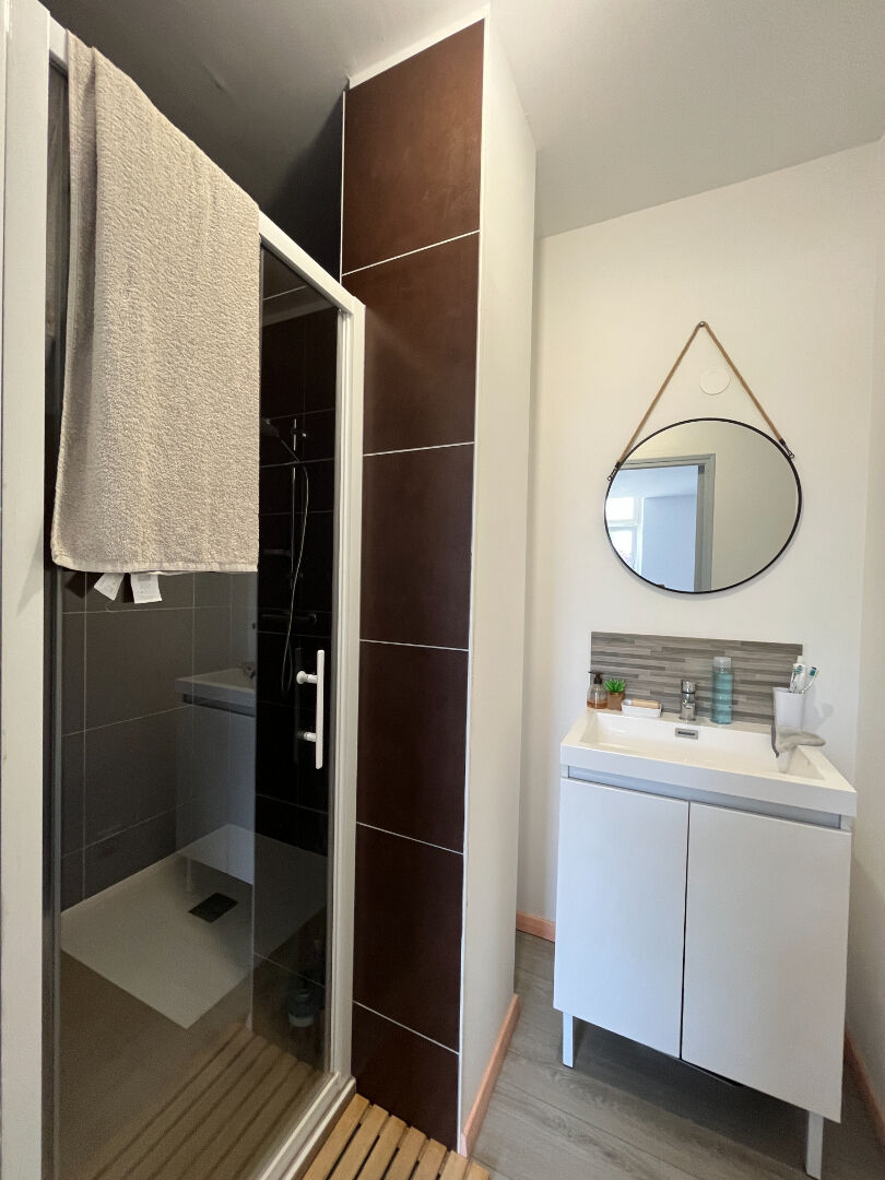 Il comprend : Une entrée, cuisine équipée ouverte sur séjour, 2 chambres, salle d'eau, toilettes.