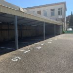 Place de stationnement pour une moto uniquement, fermée avec une barrière.