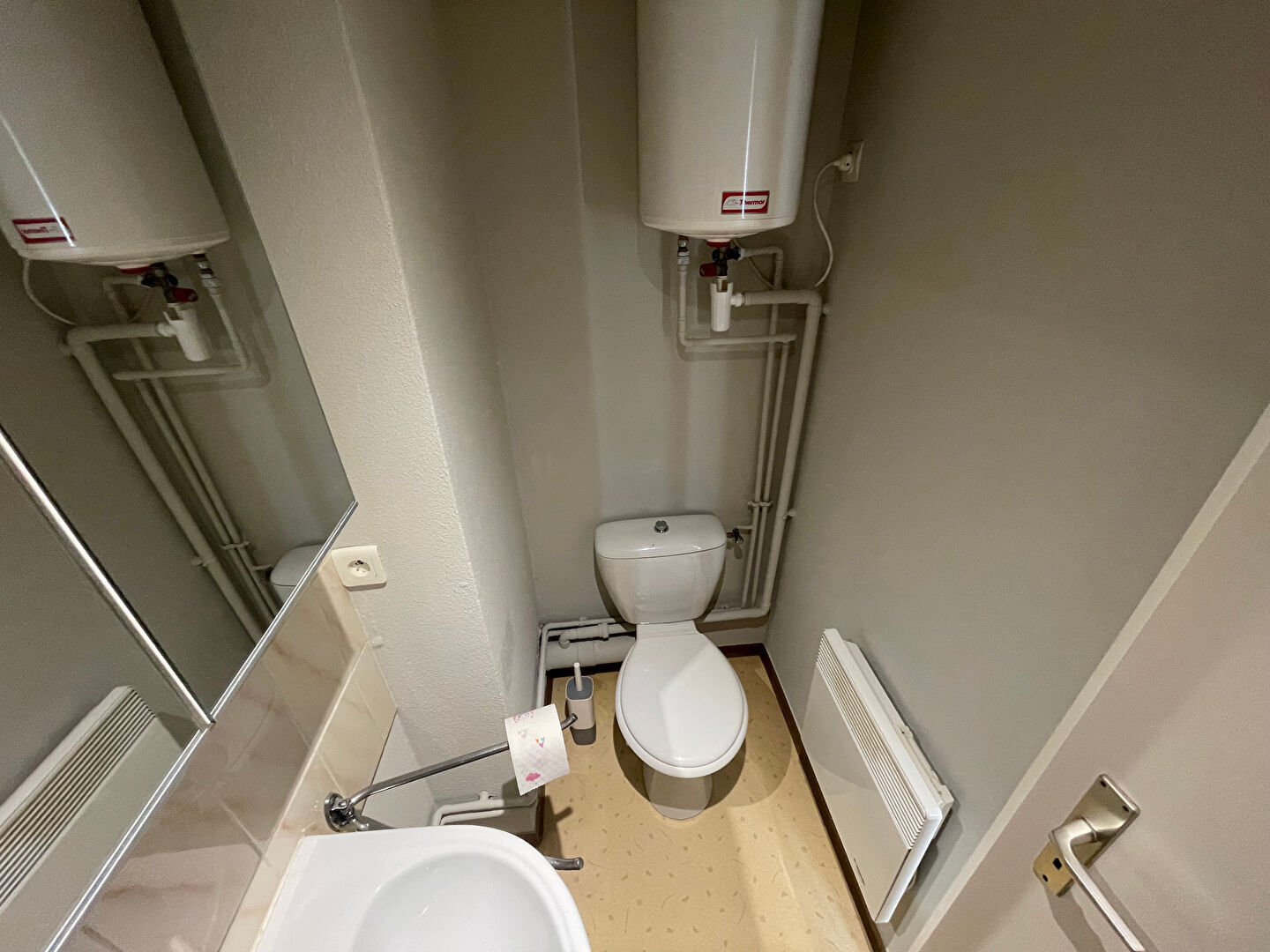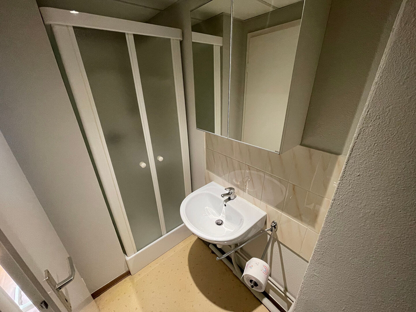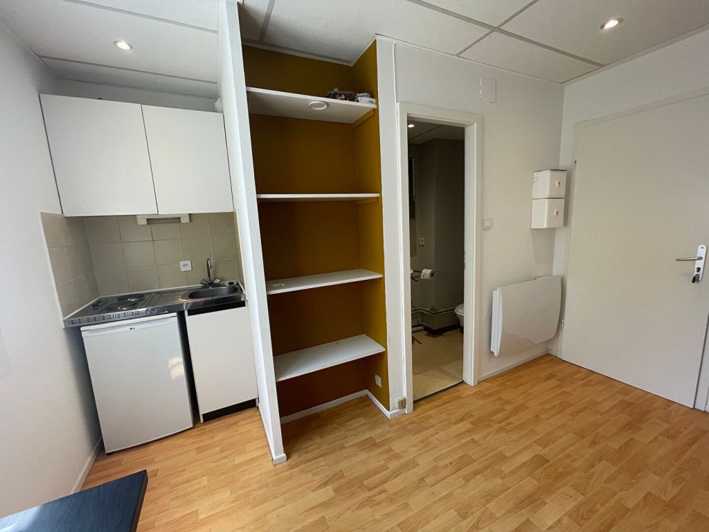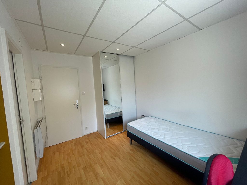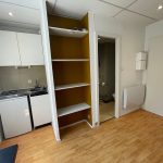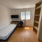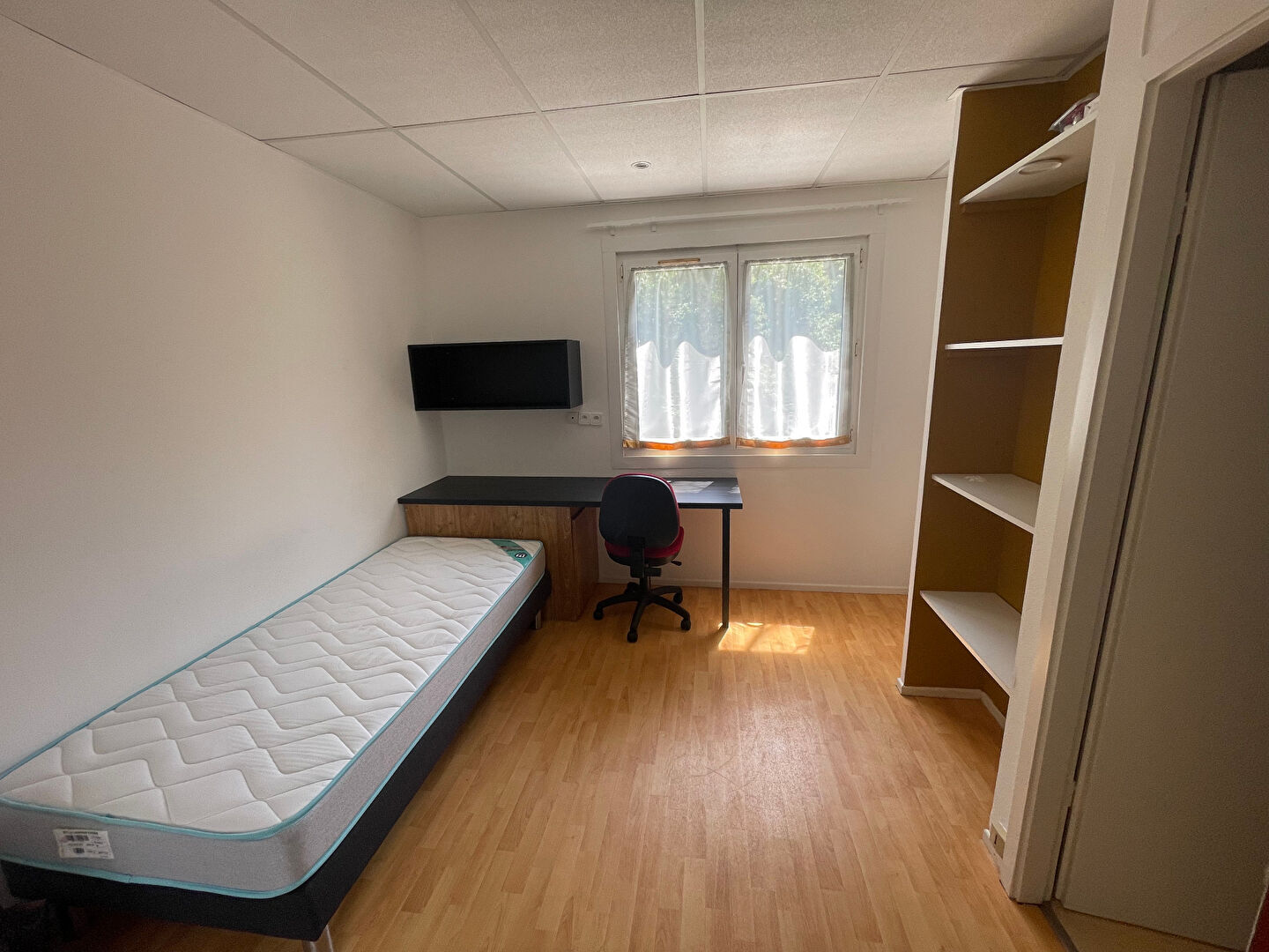 En plein coeur de la faculté de Mulhouse, une chambre comprenant un coin kitchenette avec plaques, frigo, rangement, une salle d'eau avec douche et WC, une pièce avec placards de rangement, un lit et un bureau.