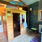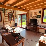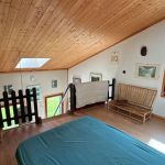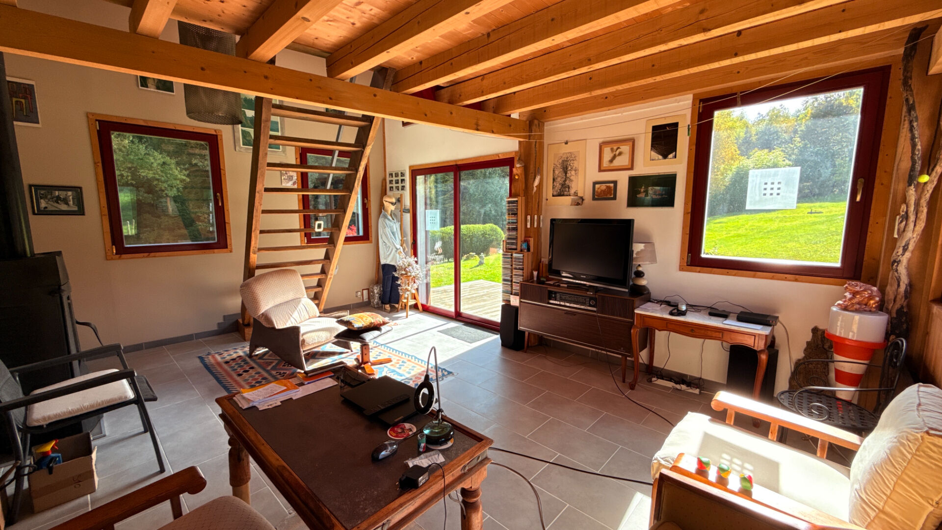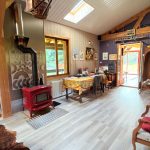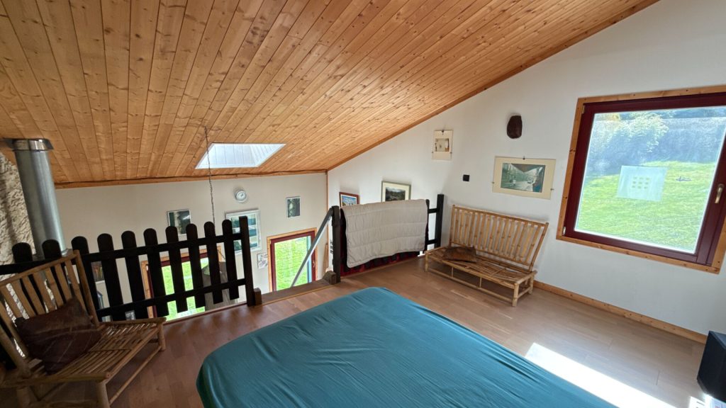 Au rez-de-chaussée : une entrée, une cuisine ouverte sur un spacieux séjour avec poêle à bois, une salle d'eau équipée d'une douche et d'un sauna, wc, deux chambres, un salon lumineux avec bois bpois, avec mezzanine donnant accès à une terrasse.