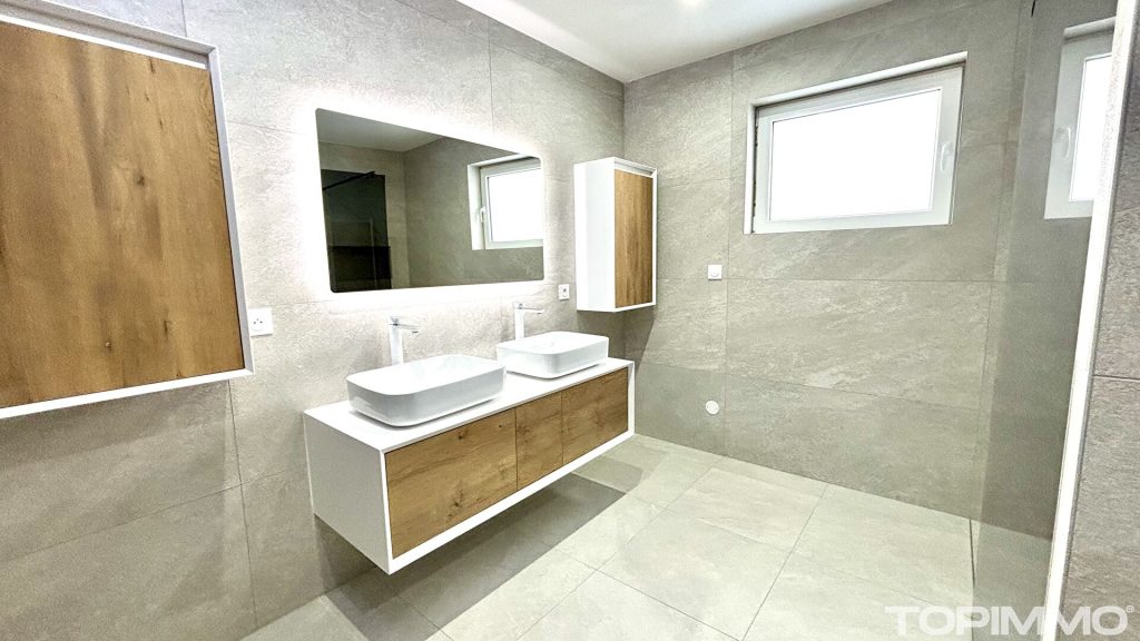 Un bien unique, livré totalement fini : cuisine et salle de bains équipées, extérieurs entièrement clôturés et aménagés avec pavage, escalier et dalles en granit, pelouse posée et terrain nécessitant très peu d'entretien. Plusieurs accès extérieurs et grandes baies vitrées offrent une luminosité exceptionnelle.