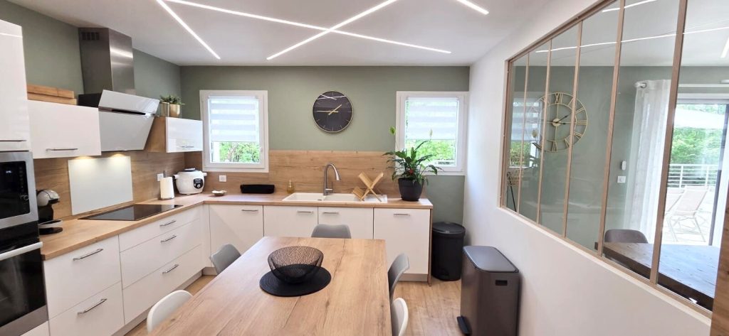La cuisine Ixina haut de gamme, entièrement équipée avec électroménager premium, se distingue par son design épuré et ses verrières contemporaines, véritables signatures architecturales.