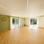 Entrée donnant accès à une pièce de vie lumineuse avec deux baies vitrées coulissantes en aluminium K-LINE donnant sur la terrasse exposée plein sud.