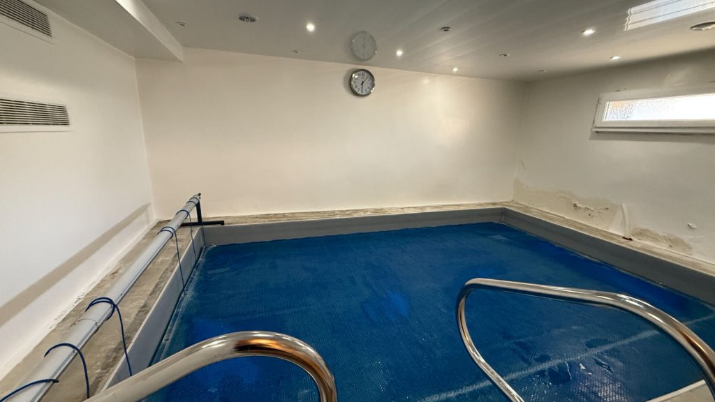 Elle se compose au rdc : entrée, cuisine, salon-séjour, salle d'eau avec douche, wc, grange, garage, et piscine intérieure.