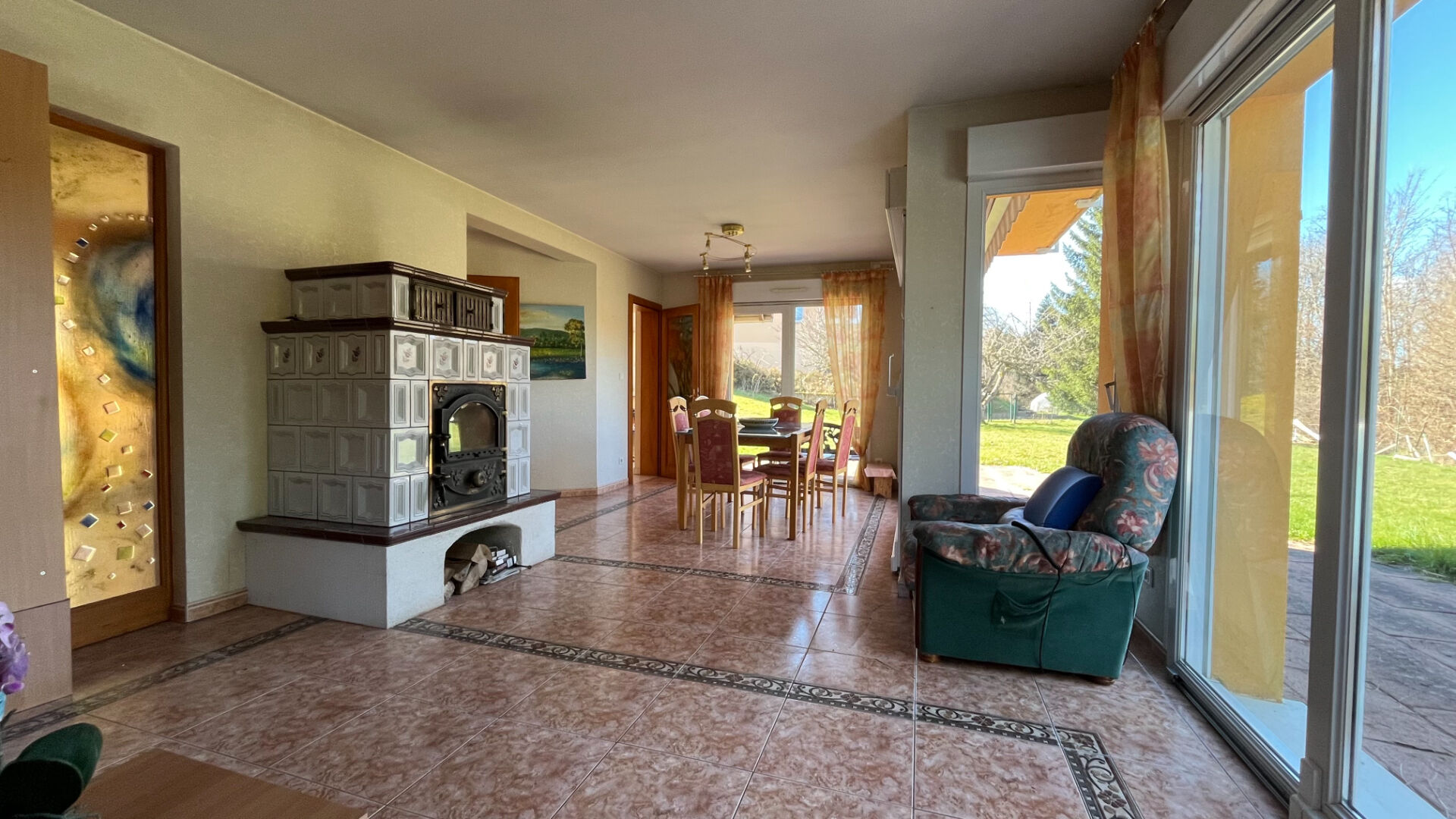 - un salon-salle à manger avec poêle en faïence de type kachelofe, avec accès direct sur la terrasse et le jardin,