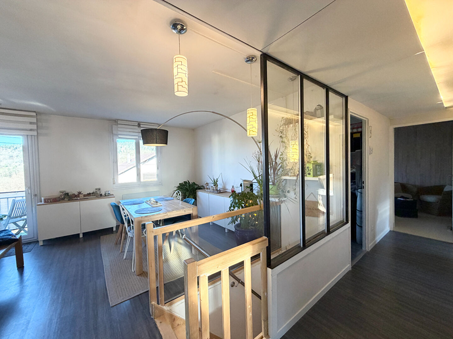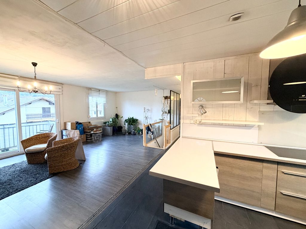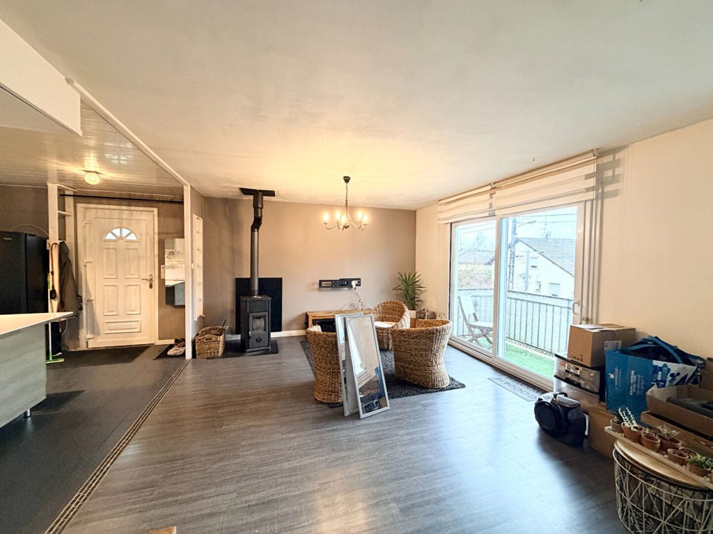 Elle est composée comme suit : une entrée, cuisine équipée ouverte sur pièce de vie (équipée d'un poêle à bois) + accès balcon, 4 chambres, salle d'eau, W.C séparés.